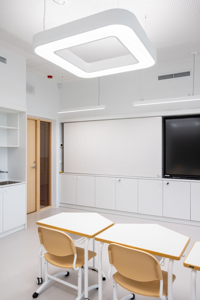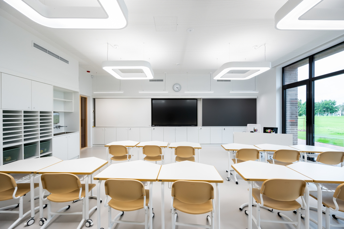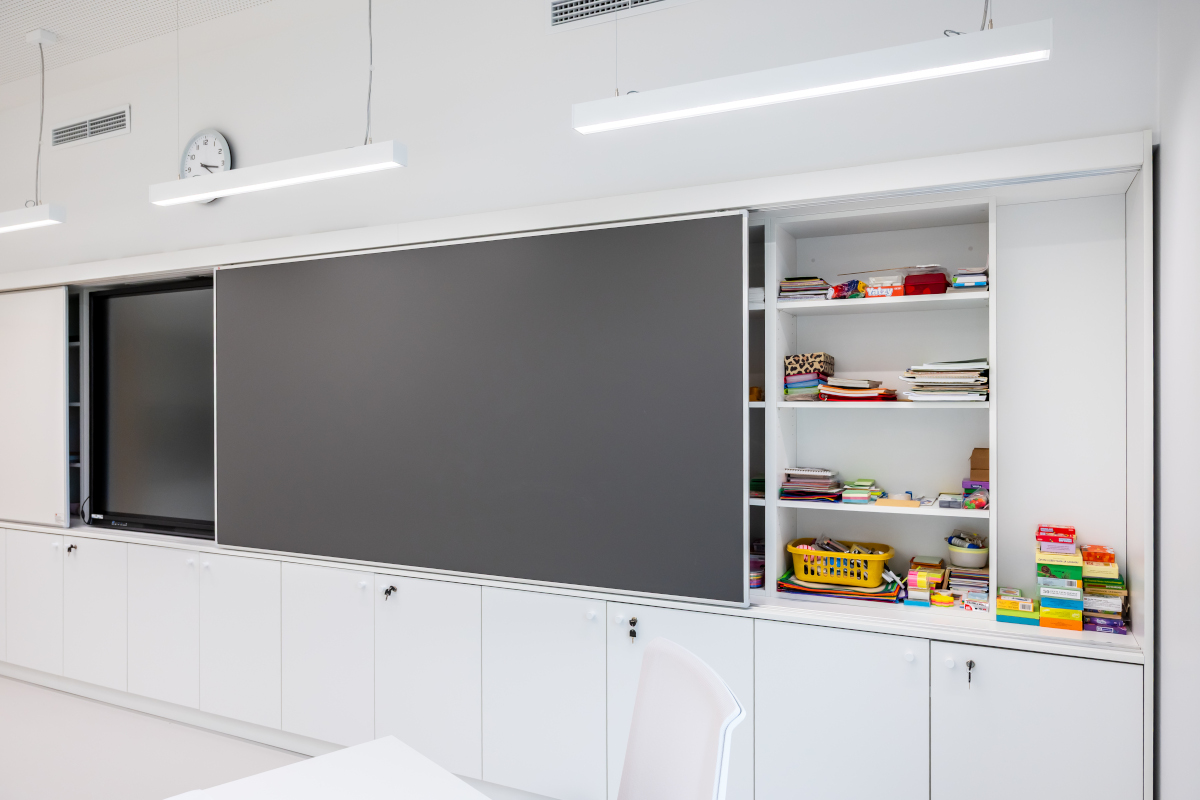 Lääneranna Gümnaasiumi uus koolimaja on multifunktsionaalne õppe- ja kasvukeskkond, mis toetab nii loomingulisi kui füüsilisi tegevusi. Klassiruumides on maheda tumehalli kriidi pinnaga Basic liugukstahvlid kombineeritud markeritahvlitega. Kriidiga kirjutamine toetab käelise tegevuse ja tähekuju õppimist – aitab lastel jälgida, kuidas tähed ja numbrid vormitakse. Liugtahvlid täidavad ka kapiuste funktsiooni.