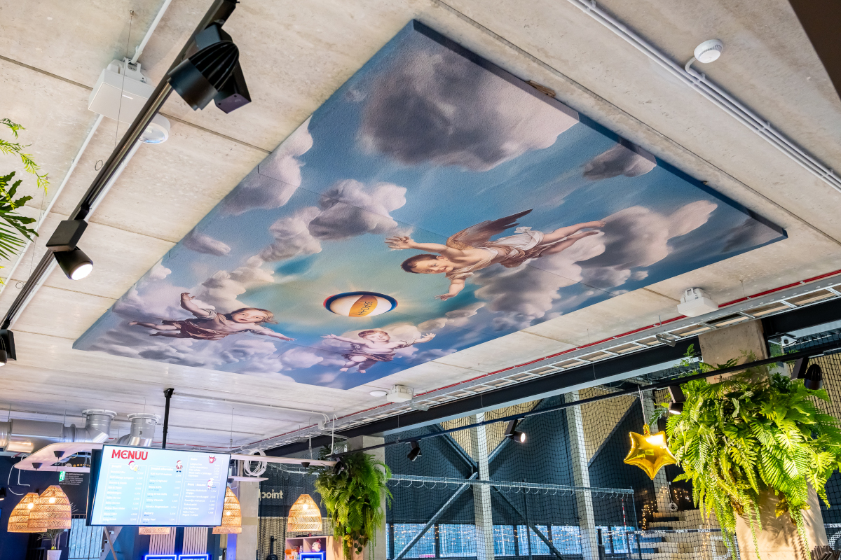 Meillä oli jälleen ilo olla mukana mielenkiintoisessa projektissa. Tallinnan läheisyydessä, Luigella, avattiin rantahalli Beach 44. Valmistimme ja asensimme Rakennuksen lounge-alueen kattoon humoristisella kuvituksella varustetun ääntä vaimentavan akustiikkapaneelin, jonka kokonaispinta-ala on 3 × 4,8 m.