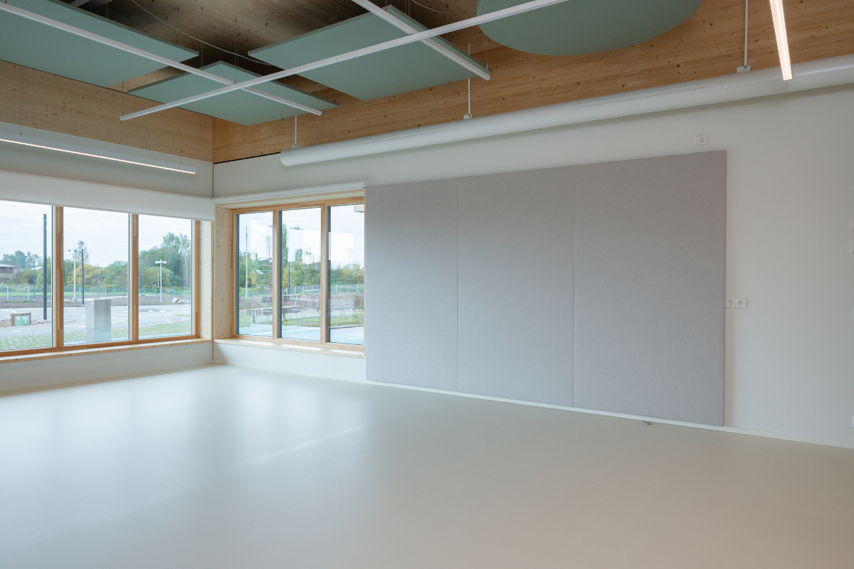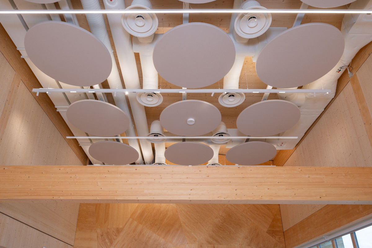 Meillä oli suuri kunnia olla mukana uuden Raadin koulutus- ja yhteisökeskuksen sisustuksessa akustiikkaratkaisuillamme. Asensimme neliön- ja ympyränmuotoisia kattopaneeleita, joiden halkaisija on 1600 mm. Niiden eloisat värit ja leikkisät muodot luovat iloisen ja inspiroivan tunnelman ja sulautuvat kauniisti tilojen yleiseen värimaailmaan.