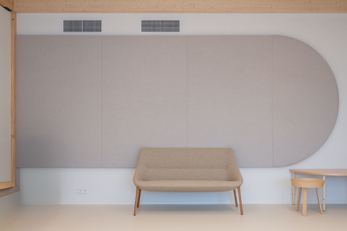 Rauhallisen harmaat seinäpaneelit tuovat visuaalista tasapainoa ja lisäävät tilan pehmeyttä sekä akustisesti että esteettisesti. Kaikki paneelit on verhoiltu 100 % luonnonvillaisella Gabriel Soul -kankaalla, joka takaa pitkäikäisen laadun ja kestävyyden.