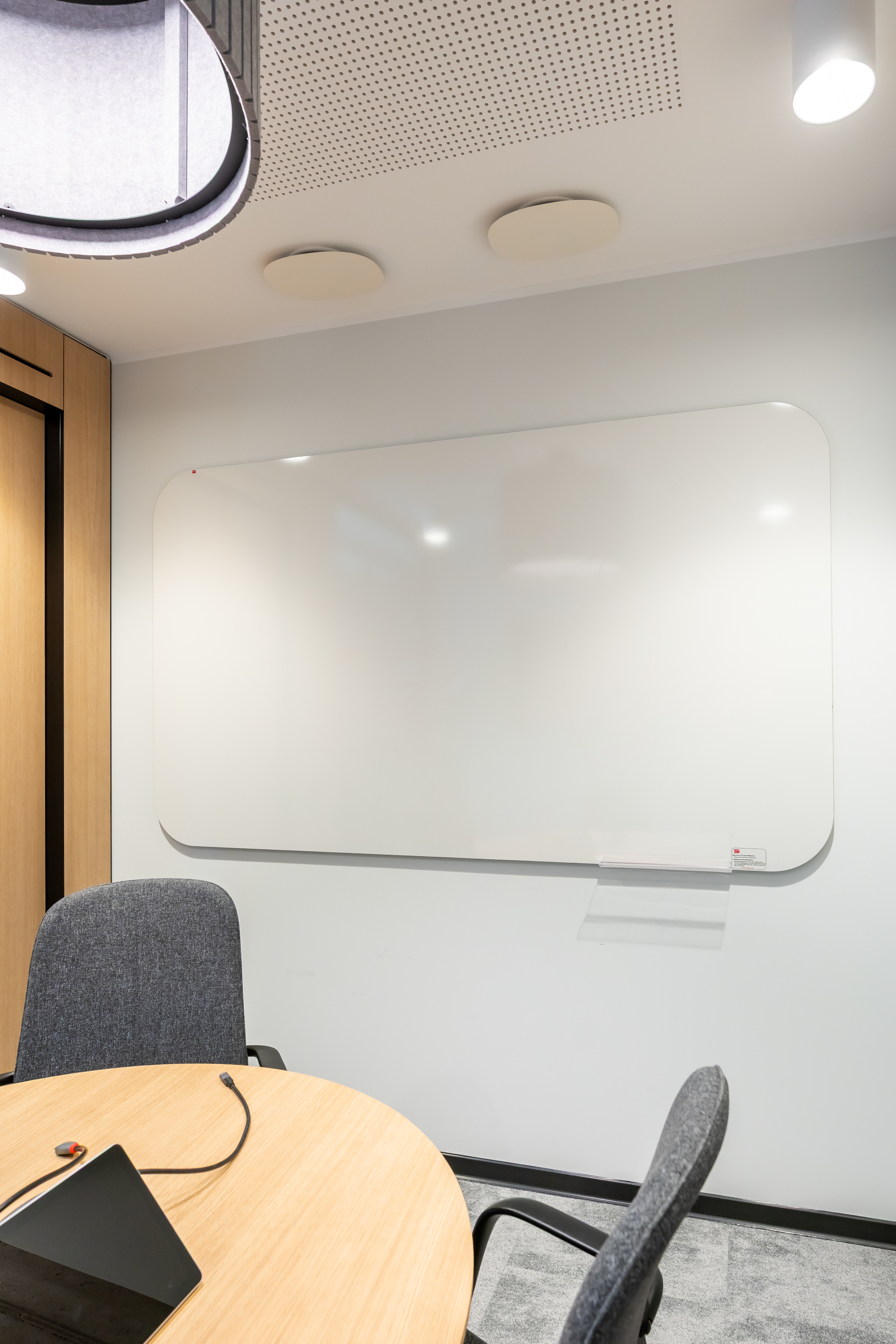 Liikuteltavien taulujen lisäksi Sunlyn toimiston neuvottelutiloista ja työalueilta löytyy tyylikkäitä Radia Kirjoitustauluja, joita on saatavana valkoisella ja vaaleanharmaalla keraamisella pinnalla.