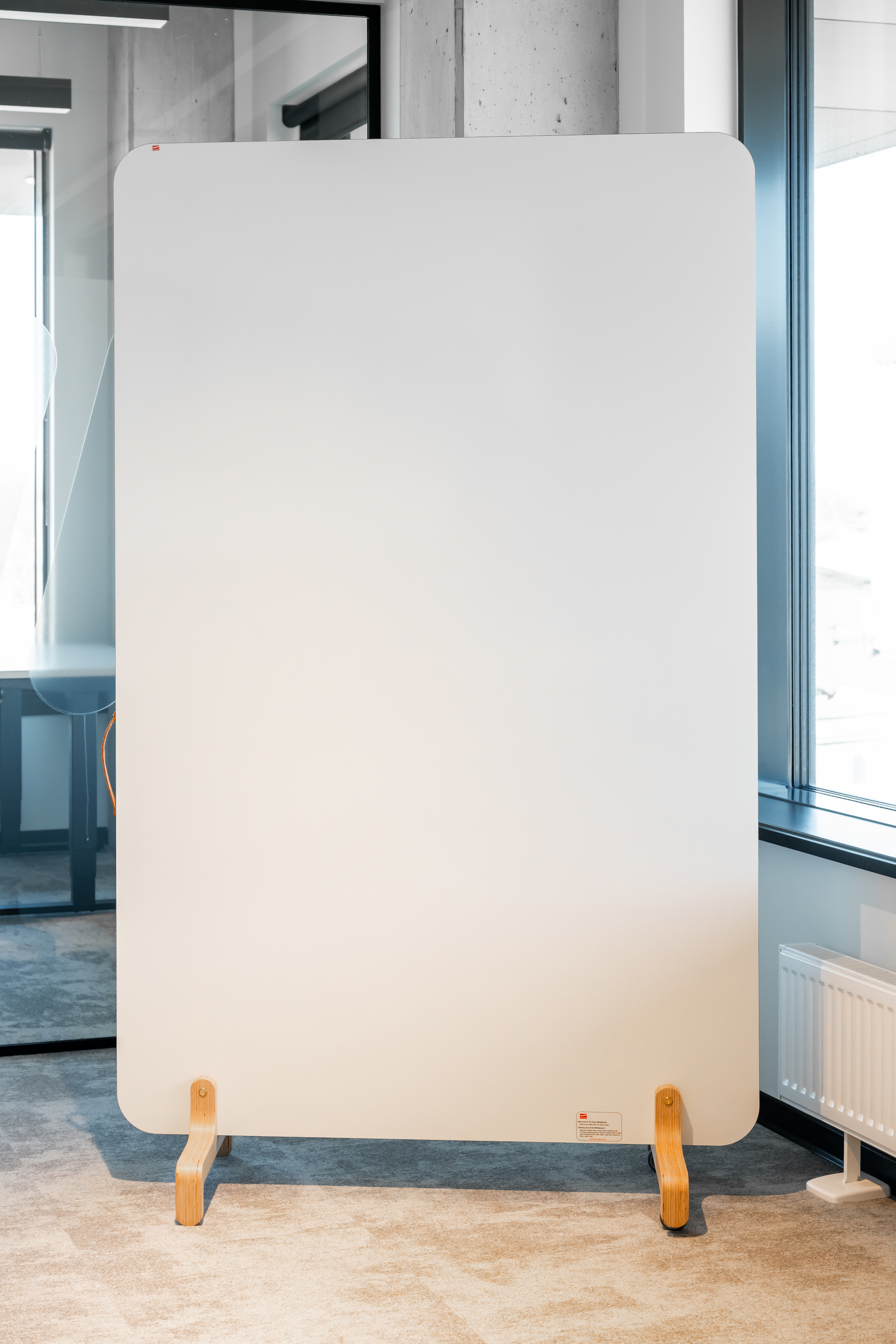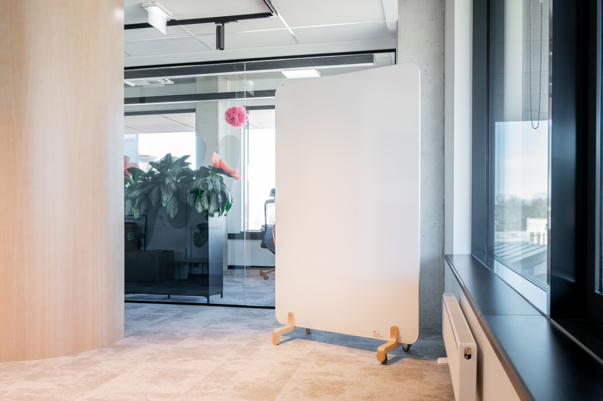 OCCO sisusti Sunlyn toimiston WriteWall Mobile kirjoitustauluilla, joissa on kestävä kaksipuolinen keraaminen pinta. Perinteisen reunalistan sijaan jaloilla seisovia tauluja reunustaa minimalistinen puujäljitelmäreuna.