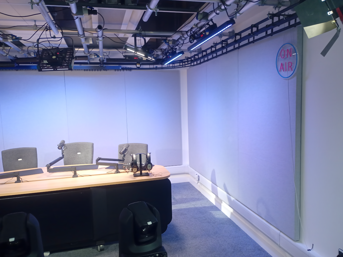 At the University of Sheffield, we delivered acoustic solutions for the Media Suite used for recording podcasts and other audio content. The project included wall-mounted Hush acoustic panels as well as mobile HushWalls to improve sound quality and reduce echo in the space. The combination of fixed and movable acoustic elements allows the studio layout to be easily adapted for different recording needs