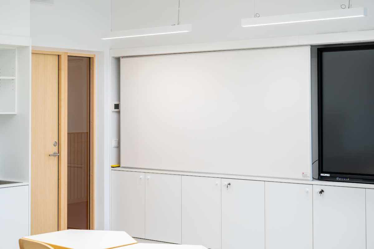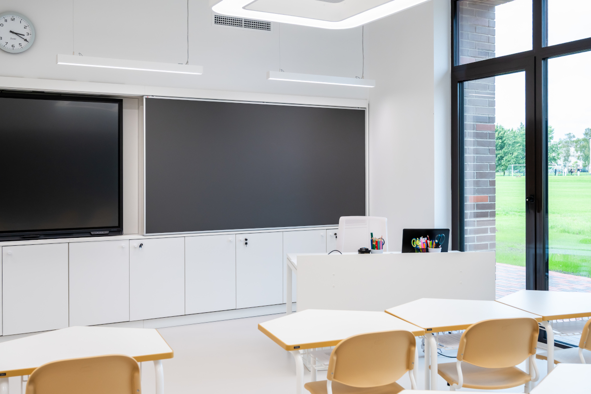 Lääneranna Gümnaasiumi uus koolimaja on multifunktsionaalne õppe- ja kasvukeskkond, mis toetab nii loomingulisi kui füüsilisi tegevusi. Klassiruumides on maheda tumehalli kriidi pinnaga Basic liugukstahvlid kombineeritud markeritahvlitega. Kriidiga kirjutamine toetab käelise tegevuse ja tähekuju õppimist – aitab lastel jälgida, kuidas tähed ja numbrid vormitakse. Liugtahvlid täidavad ka kapiuste funktsiooni.
